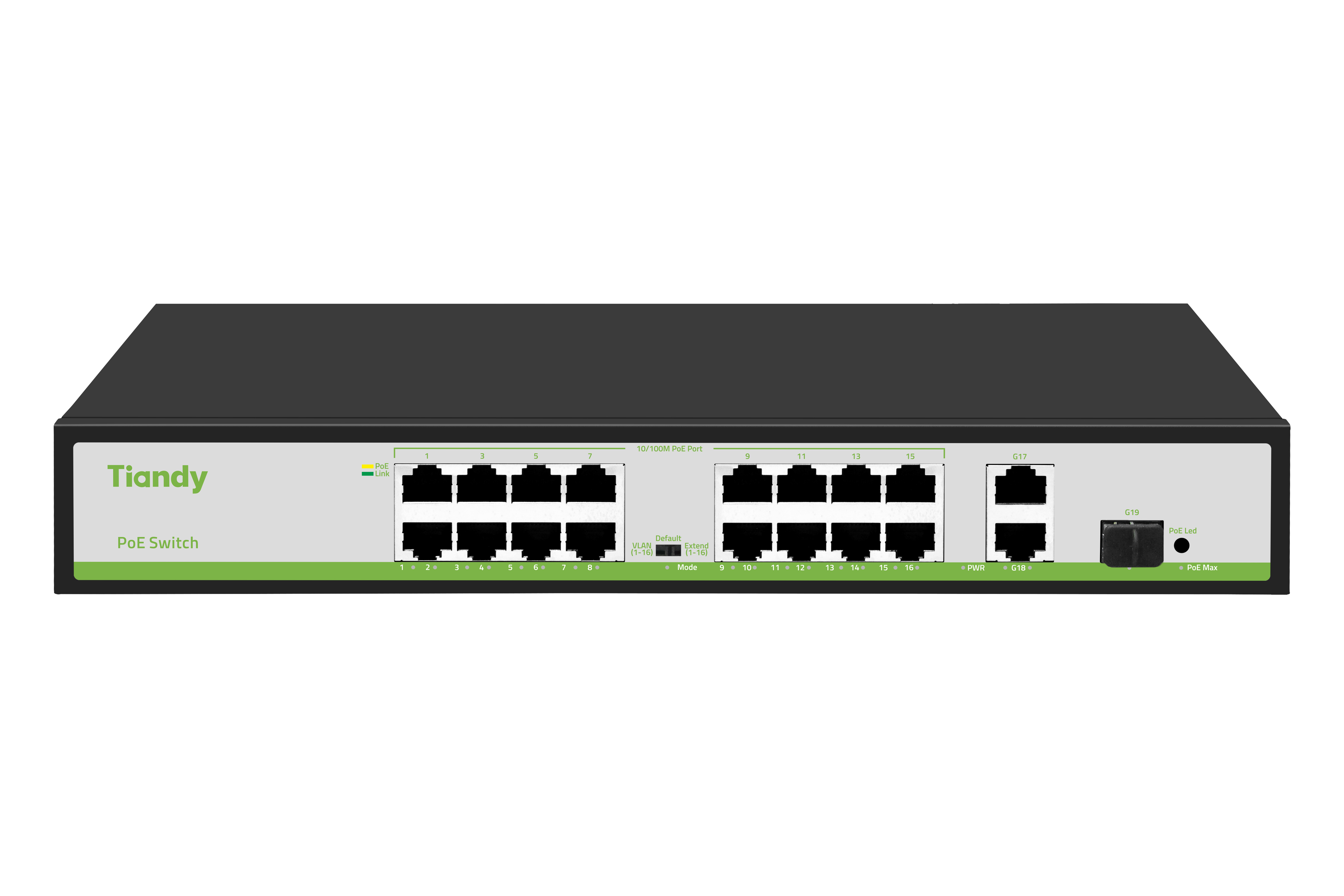 16個百兆PoE網(wǎng)口+2個千兆網(wǎng)口+1個千兆SFP口;PoE總功率190W,2-16 端口PoE最高功率30W,1號端口支持60W;符合IEEE802.3、IEEE802.3u、IEEE802.3ab、IEEE802.3x、IEEE 802.3z標準;以太網(wǎng)端口支持10/100M自適應(yīng);PoE端口在Extend模式下,1-16口 強制10M 自動開啟PoE看門狗模式;支持PoE優(yōu)先級,從1至16口依次順序,默認開啟;流控方式:全雙工采用IEEE 802.3x標準,半雙工采用Back pressure標準;零配置特性,自動供給到自適應(yīng)的設(shè)備;面板指示燈監(jiān)控工作狀態(tài)及幫助故障分析;附帶三檔一鍵智能撥碼開關(guān),支持VLAN,Default,Extend三種模式